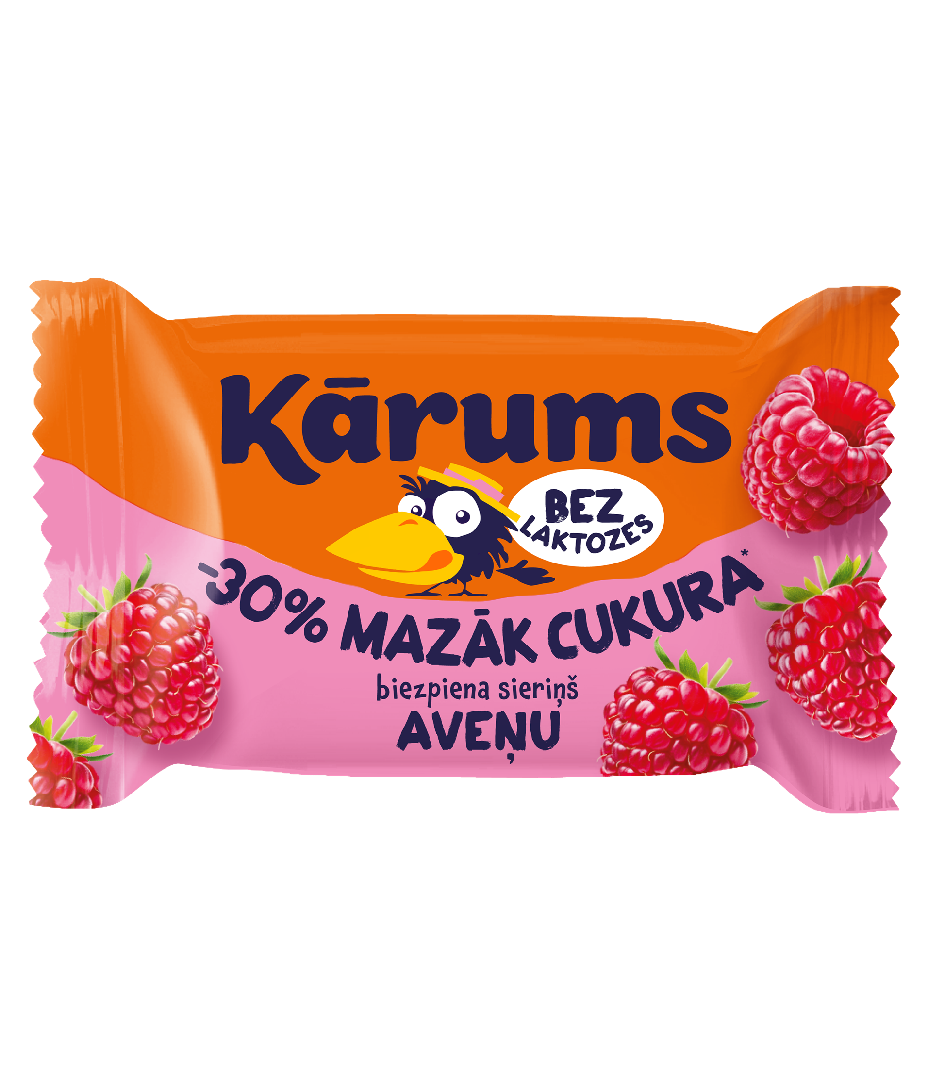 Sastāvdaļas: biezpiens bez laktozes 69%, glazūra 18% (sviests bez laktozes, cukurs, kakao pulveris), cukurs, aveņu piedeva 4,9% (cukurs, avenes 35%, fruktoze, ciete, ūdens, melno burkānu koncentrāts, dabīgs aromatizētājs), dabīgi aromatizētāji, krāsviela biešu sarkanais, aromatizētājs vanilīns.